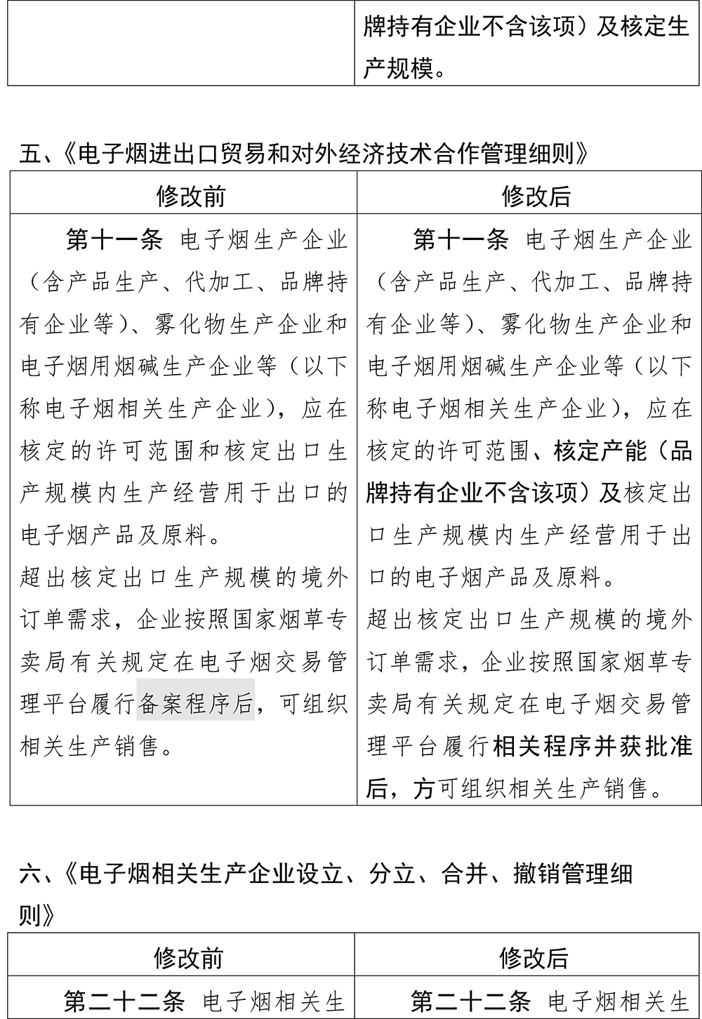《電子煙進(jìn)出口貿(mào)易和對(duì)外經(jīng)濟(jì)技術(shù)合作管理細(xì)則》修改了一處,修改后的第十條,是要求電子煙生產(chǎn)企業(yè)(含產(chǎn)品生產(chǎn)、代加工、品牌持有企業(yè)等)、霧化物生產(chǎn)企業(yè)和電子煙用煙堿生產(chǎn)企業(yè)等(以下稱電子煙相關(guān)生產(chǎn)企業(yè)),應(yīng)在核定的許可范圍、核定產(chǎn)能(品牌持有企業(yè)不含該項(xiàng))及核定出口生產(chǎn)規(guī)模內(nèi)生產(chǎn)經(jīng)營用于出口的電子煙產(chǎn)品及原料。超出核定出口生產(chǎn)規(guī)模的境外訂單需求,企業(yè)按照國家煙草專賣局有關(guān)規(guī)定在電子煙交易管理平臺(tái)履行相關(guān)程序并獲批準(zhǔn)后,方可組織相關(guān)生產(chǎn)銷售。