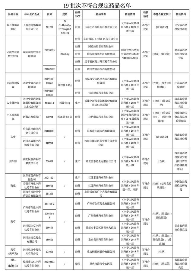 國(guó)家藥監(jiān)局表示,對(duì)上述不符合規(guī)定藥品,藥品監(jiān)督管理部門已要求相關(guān)企業(yè)和單位采取暫停銷售使用、召回等風(fēng)險(xiǎn)控制措施,對(duì)不符合規(guī)定原因開展調(diào)查并切實(shí)進(jìn)行整改。