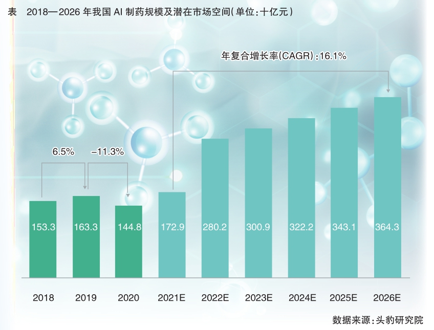 AI制藥的市場增速和空間與創(chuàng)新藥市場占比、AI技術迭代升級都息息相關。頭豹研究院預計,根據(jù)目前我國醫(yī)藥市場情況,以及AI制藥各市場主體的在研項目情況,未來創(chuàng)新藥市場占整體醫(yī)藥市場的比例或?qū)⑦_到15%;預計我國AI制藥在2021—2026年期間的年復合增長率(CAGR)為16.1%,2026年的潛在市場空間將達到3643億元。