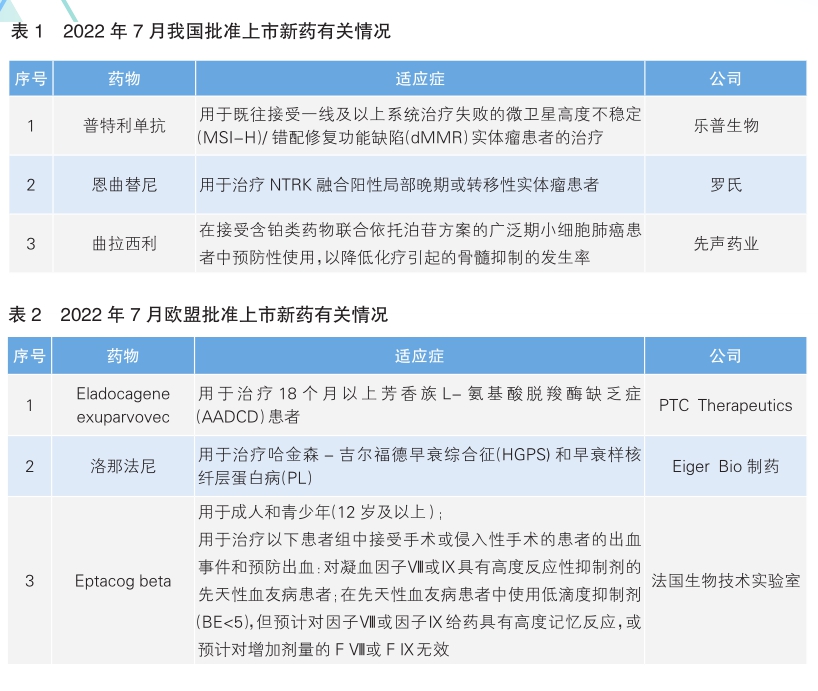 7月份,我國共批準3款新藥上市(詳見表1),其中附條件批準的普特利單抗為我國藥企樂普生物自主研發(fā)。