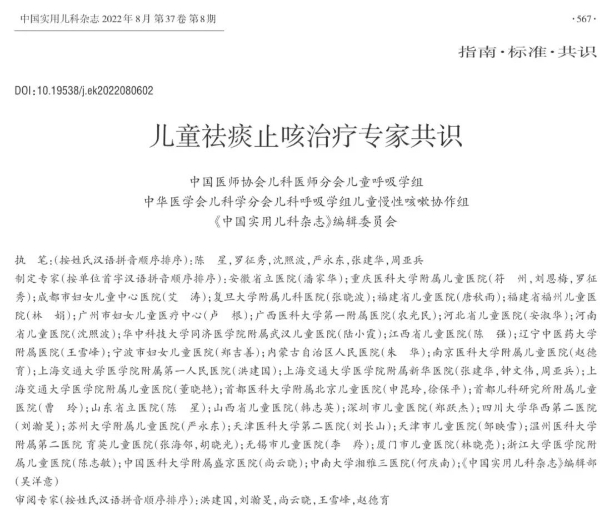 近日,由中國醫(yī)師協(xié)會(huì)兒科醫(yī)師分會(huì)兒童呼吸專家組、中華醫(yī)學(xué)會(huì)兒科學(xué)分會(huì)兒科呼吸學(xué)組兒童慢性咳嗽協(xié)作組、《中國實(shí)用兒科雜志》編輯委員會(huì)發(fā)起,組織全國40位專家制定了《兒童祛痰止咳治療專家共識(shí)》,該共識(shí)發(fā)布于中國實(shí)用兒科雜志2022年8月第37卷第8期。