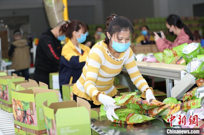 圖為工人包裝螺螄粉?!≈炝?攝