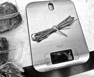 記者對(duì)螃蟹捆扎繩稱重。 施本允/攝