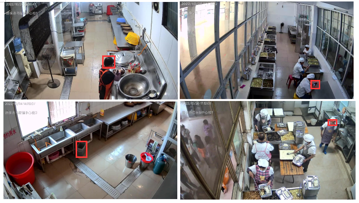 百色市食品安全智能服務(wù)平臺(tái)系統(tǒng)要求,學(xué)校食堂分別在后廚的切配區(qū)、烹飪區(qū)、洗消區(qū)安裝云攝像頭,通過(guò)互聯(lián)網(wǎng)接入平臺(tái),重點(diǎn)對(duì)學(xué)校食堂后廚加工的常見(jiàn)違規(guī)行為,如有害生物、未戴帽子、未戴口罩、吸煙、玩手機(jī)、未蓋垃圾桶蓋等,運(yùn)用AI智能可視化自動(dòng)抓拍,并將整改通知及時(shí)發(fā)送至轄區(qū)監(jiān)管人員和學(xué)校食品安全責(zé)任人手機(jī)上,督促其及時(shí)整改,確保了食材加工全視角的過(guò)程可控。