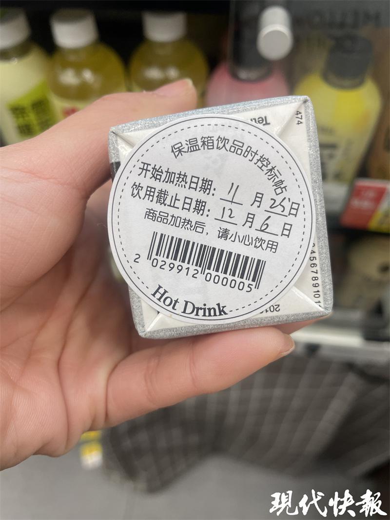 放在暖柜中的飲料,安全飲用期限最受關(guān)注。在走訪中,現(xiàn)代快報(bào)記者注意到,大部分放置在便利店暖柜中的飲料,都會加貼一張產(chǎn)品標(biāo)簽。這份產(chǎn)品標(biāo)簽叫作保溫箱飲品時控標(biāo)貼,包含了飲品的開始加熱日期和飲用截止日期。按照飲品類別的不同,飲品時控的天數(shù)也不一樣。但是幾乎所有飲品在經(jīng)過加熱保溫處理后的保質(zhì)期,都比常溫狀態(tài)下的保質(zhì)期縮短了不少。以一款常溫狀態(tài)下保質(zhì)期為 9 個月的飲品為例,它在暖柜中經(jīng)過加熱后,僅有 14 天的賞味期。
