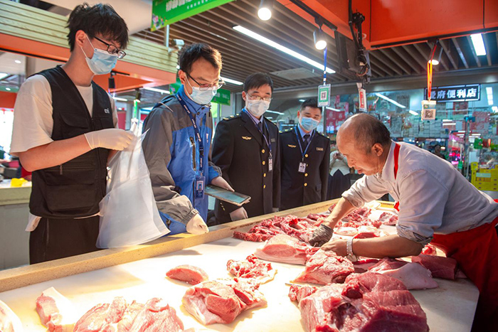 愛(ài)府路農(nóng)貿(mào)市場(chǎng)現(xiàn)場(chǎng)抽取豬肉封裝。明光市市場(chǎng)監(jiān)督管理局供圖