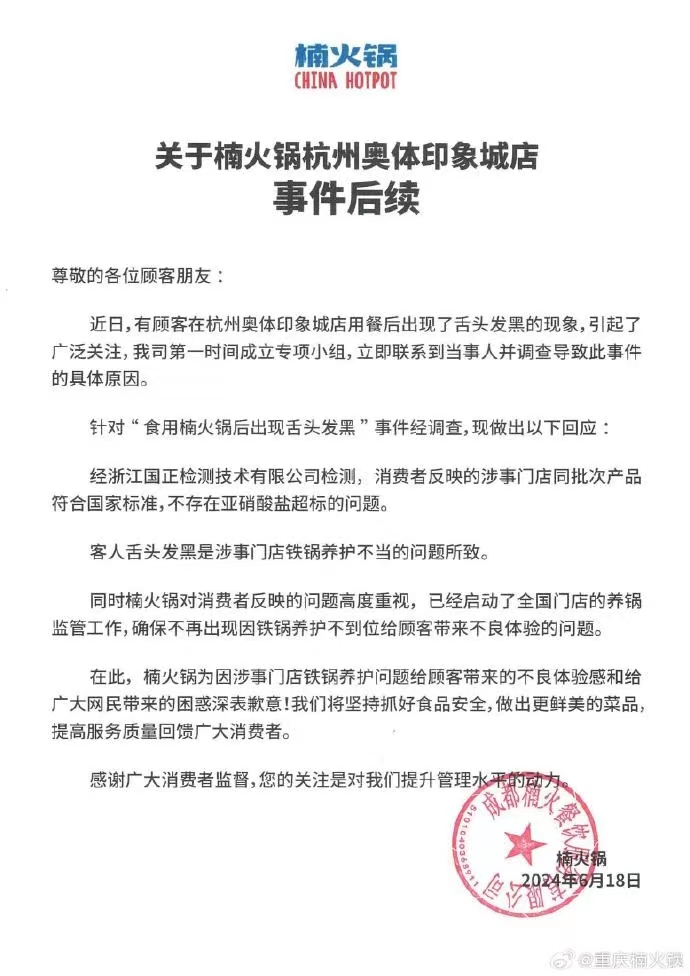 6月19日,“楠火鍋”公布了檢測(cè)結(jié)果,表示:“經(jīng)浙江國正檢測(cè)技術(shù)有限公司檢測(cè),消費(fèi)者反映的涉事門店同批次產(chǎn)品符合國家標(biāo)準(zhǔn),不存在亞硝酸鹽超標(biāo)的問題。客人舌頭發(fā)黑是因涉事門店鐵鍋養(yǎng)護(hù)不當(dāng)所致。“楠火鍋”對(duì)消費(fèi)者反映的情況高度重視,已啟動(dòng)全國門店的養(yǎng)鍋監(jiān)管工作,確保不再出現(xiàn)因鐵鍋養(yǎng)護(hù)不到位給顧客帶來不良體驗(yàn)的問題?!?/p>