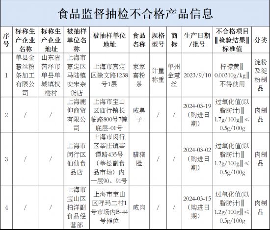 對上述抽檢中發(fā)現(xiàn)的不合格產(chǎn)品,上海市市場監(jiān)管局已要求相關區(qū)市場監(jiān)督管理局及時對不合格食品及其生產(chǎn)經(jīng)營者進行調(diào)查處理,依法查處違法行為,進一步督促經(jīng)營者履行法定義務,并將相關情況記入食品生產(chǎn)經(jīng)營者食品安全信用檔案。查處情況由經(jīng)營者所在地負責案件查辦的區(qū)市場監(jiān)督管理局按規(guī)定公開。