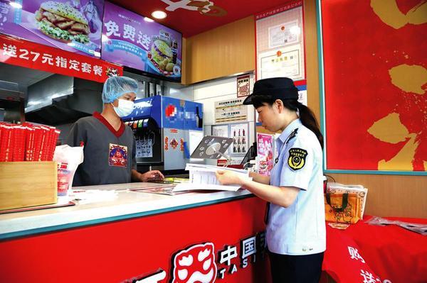 執(zhí)法人員檢查漢堡店臺賬記錄。通訊員何正君 攝