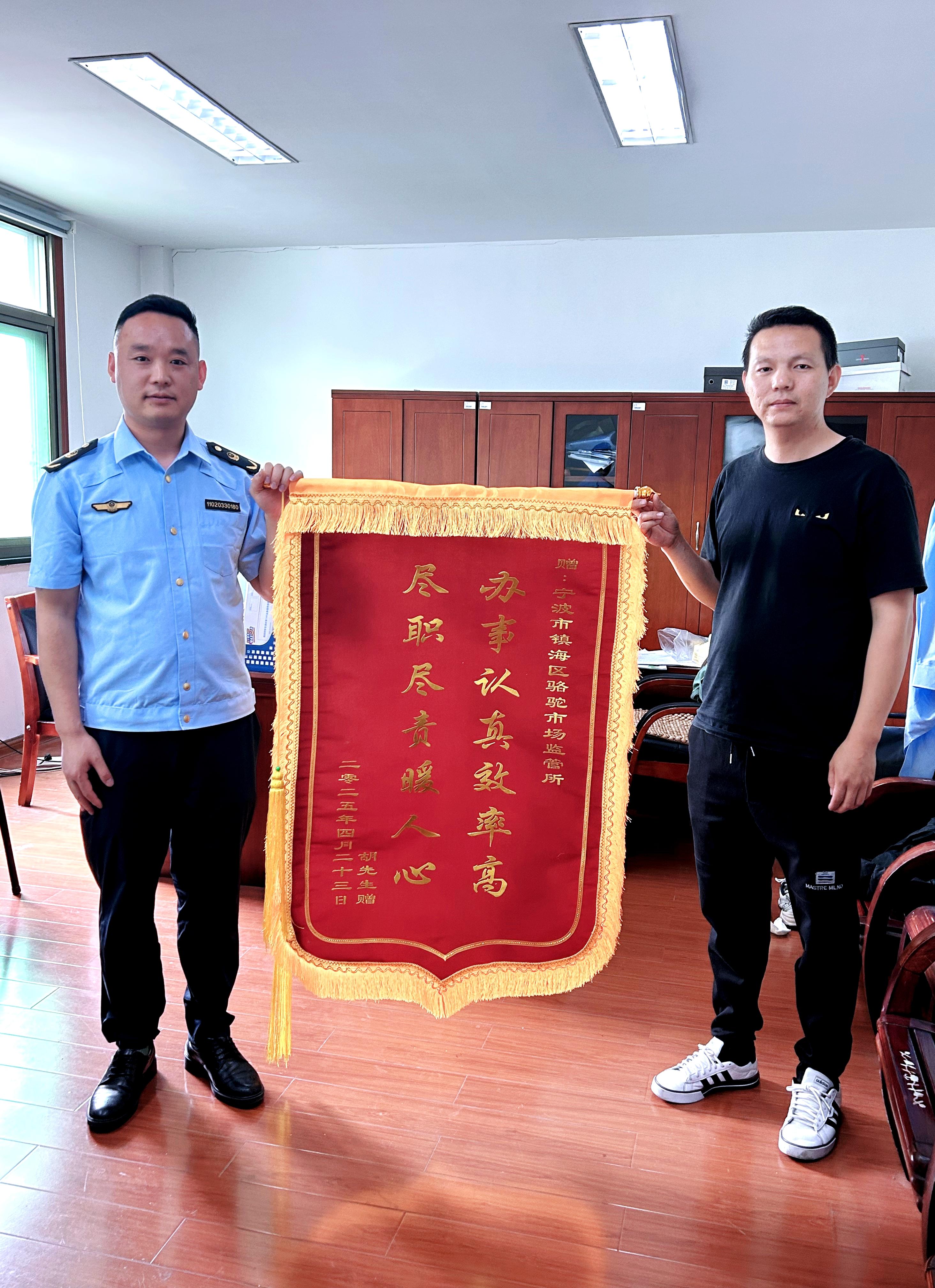 執(zhí)法不是冷冰冰的罰單,而是有溫度的服務(wù)。5月6日,老胡捧著“辦事認(rèn)真效率高 盡職盡責(zé)暖人心”的錦旗來到駱駝市場監(jiān)管所,和執(zhí)法人員一起拍下了一張有溫度的照片。