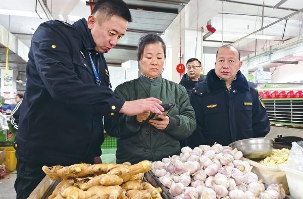 圖為聯(lián)合執(zhí)法人員針對本地風(fēng)險突出的重點農(nóng)產(chǎn)品生姜進行重點檢查。本報記者 喬燕強 攝