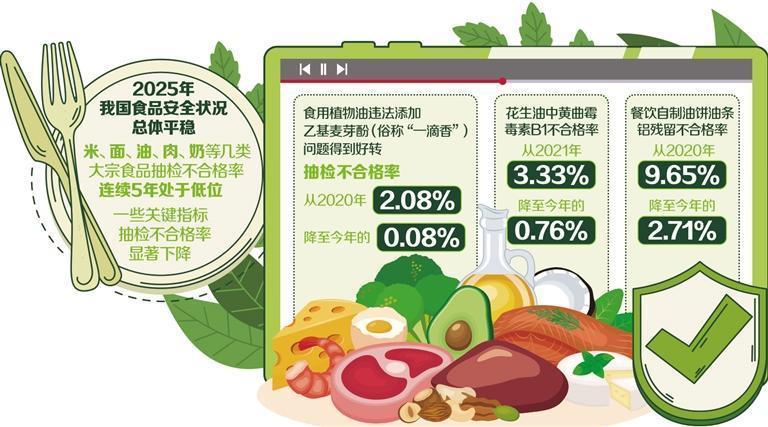 食用植物油違法添加“一滴香”問題明顯好轉(zhuǎn),粉絲粉條、餐飲自制油餅油條的鋁殘留不合格率持續(xù)下降,米面油肉奶等幾類大宗食品的不合格率連續(xù)5年處于低位……今年以來,全國食品安全監(jiān)督抽檢覆蓋了不少消費者生活中常買、常吃的食材,食品安全治理能力和水平穩(wěn)步提升。