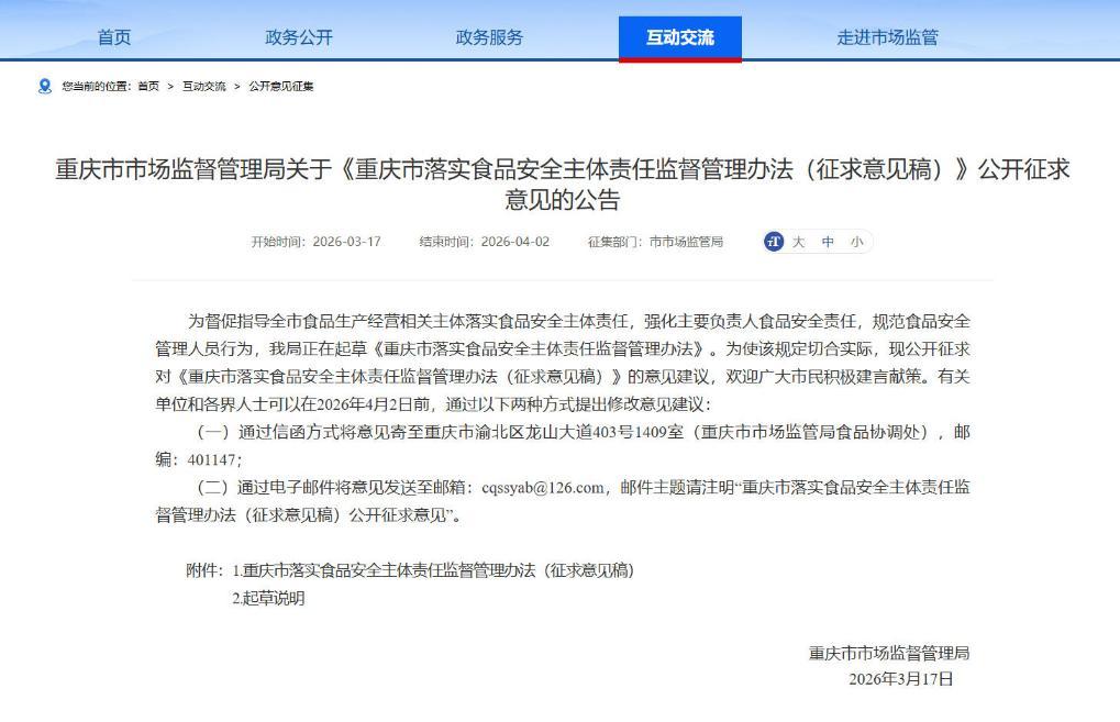 為進(jìn)一步梳理、細(xì)化、規(guī)范各類食品生產(chǎn)經(jīng)營(yíng)主體的食品安全主體責(zé)任制要求,持續(xù)推動(dòng)食品安全風(fēng)險(xiǎn)防線前移,不斷提升食品安全管控質(zhì)效,近日,重慶市市場(chǎng)監(jiān)督管理局起草了《重慶市落實(shí)食品安全主體責(zé)任監(jiān)督管理辦法(征求意見稿)》(以下簡(jiǎn)稱《辦法》),現(xiàn)向社會(huì)公開征求意見建議。