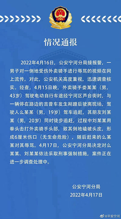 4月17日,天津市公安局寧河公安分局發(fā)布情況通報。通報中指出,4月16日,寧河公安分局接報警,一男子對一倒地受傷外賣騎手進行辱罵的視頻在網(wǎng)上流傳。經(jīng)查,4月15日晚,外賣騎手婁某某駕駛電動自行車途經(jīng)寧河區(qū)蘆臺街時,與一輛停在路邊的吉普車發(fā)生剮蹭后駛離現(xiàn)場,駕駛?cè)嗣茨衬绸{車追趕,其朋友劉某某同時徒步追趕,過程中劉某某用拳頭擊打外賣騎手頭部,致其倒地磕破頭皮,形成6厘米傷口(無生命危險),隨后趕來的么某某對其辱罵。