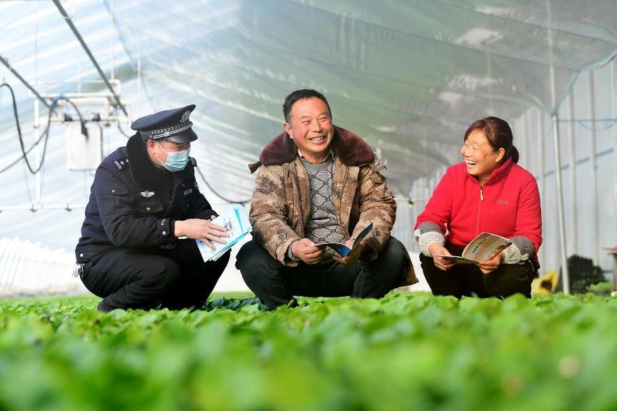 1月29日,安徽省阜南縣公安局會龍鎮(zhèn)派出所民警在轄區(qū)豐振生態(tài)農(nóng)業(yè)科技園溫室大棚里,向種植戶宣講防范網(wǎng)絡電信詐騙知識。
