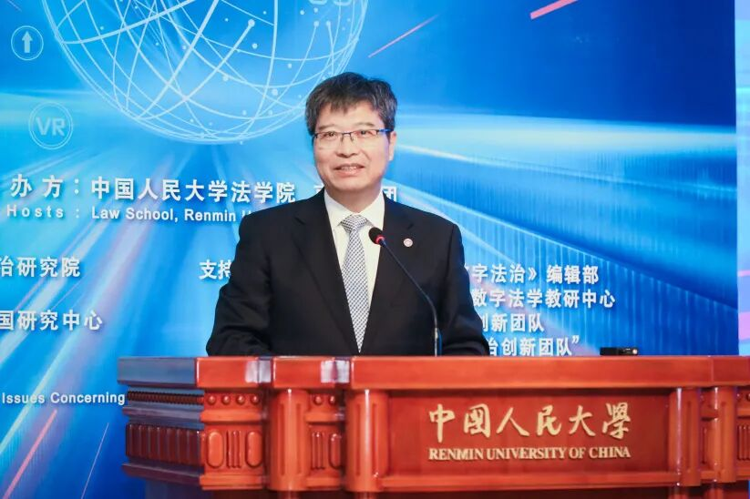 圖為中國人民大學(xué)校長(zhǎng)林尚立在平行主題論壇——第六屆“未來法治與數(shù)字法學(xué)”國際論壇中致辭。
