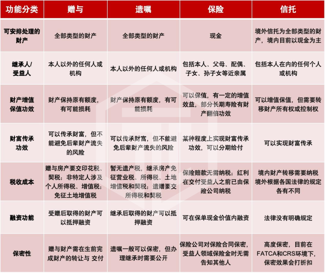 以上即為幾種常用財(cái)富傳承工具的對(duì)比與分析,我們可以結(jié)合自身情況進(jìn)行傳承規(guī)劃的安排。