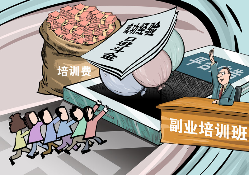 劉云的遭遇并非個(gè)例。南京大學(xué)一項(xiàng)調(diào)研數(shù)據(jù)顯示,我國(guó)一邊工作一邊干副業(yè)的人已經(jīng)超過(guò)8000萬(wàn)。如此龐大的人群,迅速點(diǎn)燃了職業(yè)培訓(xùn)市場(chǎng)。從緊隨低碳風(fēng)潮推出的碳排放管理師報(bào)考培訓(xùn)班到伴隨直播帶貨興起的個(gè)人IP“點(diǎn)金術(shù)”,從60天速成月入過(guò)萬(wàn)元的自媒體寫(xiě)手、到學(xué)習(xí)20天就能接單的手辦課……眼花繚亂的培訓(xùn)中摻雜各種亂象,讓“劉云”們成了被割的“韭菜”。