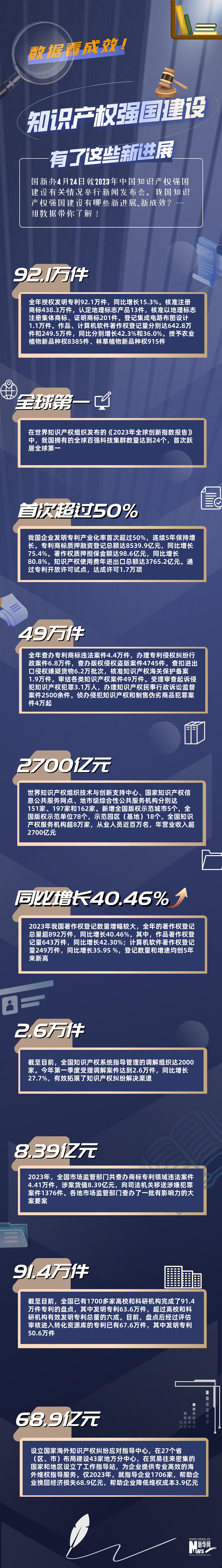 國新辦4月24日就2023年中國知識產(chǎn)權(quán)強國建設(shè)有關(guān)情況舉行新聞發(fā)布會。我國知識產(chǎn)權(quán)強國建設(shè)有哪些新進展、新成效?一組數(shù)據(jù)帶你了解!