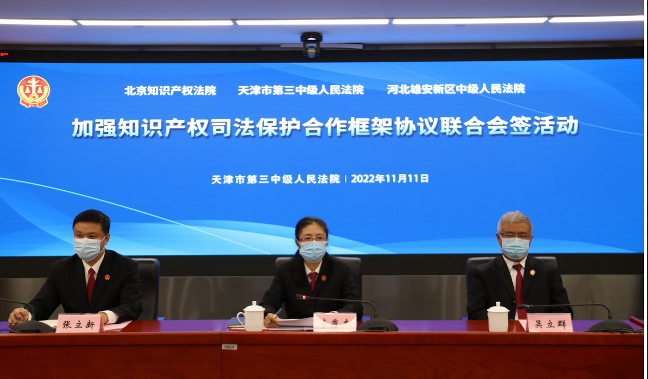 黨的二十大報告明確提出“加強知識產(chǎn)權法治保障,形成支持全面創(chuàng)新的基礎制度”,同時提出“促進區(qū)域協(xié)調(diào)發(fā)展”并將“推進京津冀協(xié)同發(fā)展”擺在首位。11月11日,北京知識產(chǎn)權法院與天津市第三中級人民法院、河北雄安新區(qū)中級人民法院共同簽署《加強知識產(chǎn)權司法保護合作框架協(xié)議》,深入貫徹落實黨的二十大精神和黨中央決策部署,開啟京津冀知識產(chǎn)權協(xié)同保護事業(yè)新征程,為京津冀協(xié)同發(fā)展和國家創(chuàng)新驅(qū)動發(fā)展戰(zhàn)略實施作出新的更大貢獻。