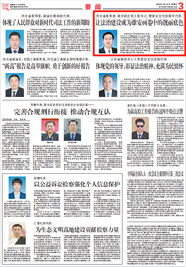 3月10日出版的《檢察日?qǐng)?bào)》刊發(fā)了題為《河北省委常委,雄安新區(qū)黨工委書記、管委會(huì)主任張國(guó)華代表: 讓法治建設(shè)成為雄安畫卷中的靚麗底色 》的報(bào)道,一起來(lái)看↓↓↓