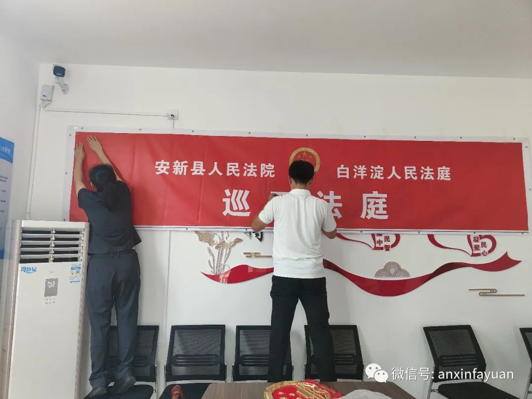 白洋淀人民法庭的干警們在圈頭鄉(xiāng)群眾工作中心懸掛國徽、拉條幅,架設移動數(shù)字法庭設備,迅速搭建起一個簡易的巡回法庭 攝影:王杰