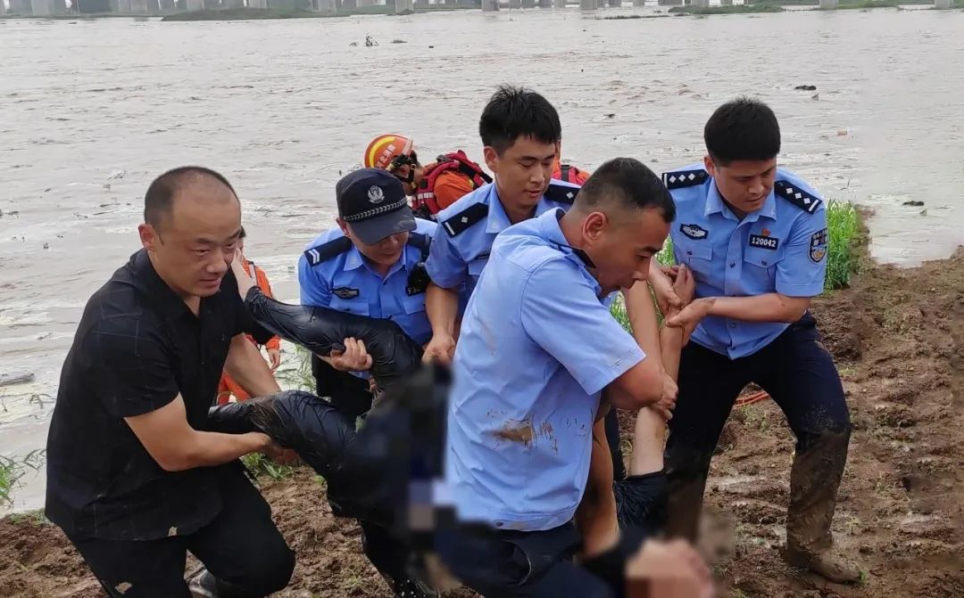因分洪道周邊土質(zhì)較軟、道路泥濘,車輛難以通行,時(shí)間就是生命,民警來不及猶豫,全部脫掉鞋子光腳踩過50公分深淤泥區(qū)翻越北大堤后到達(dá)現(xiàn)場(chǎng),發(fā)現(xiàn)兩人被困于某項(xiàng)目部南側(cè)新蓋房分洪道內(nèi)。