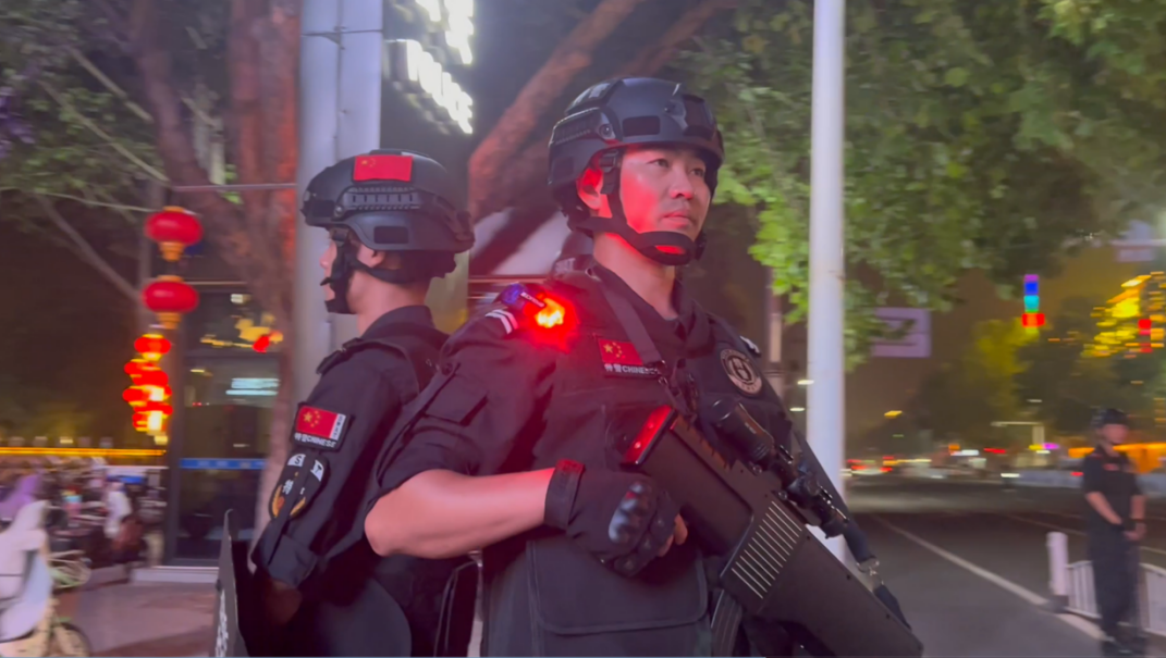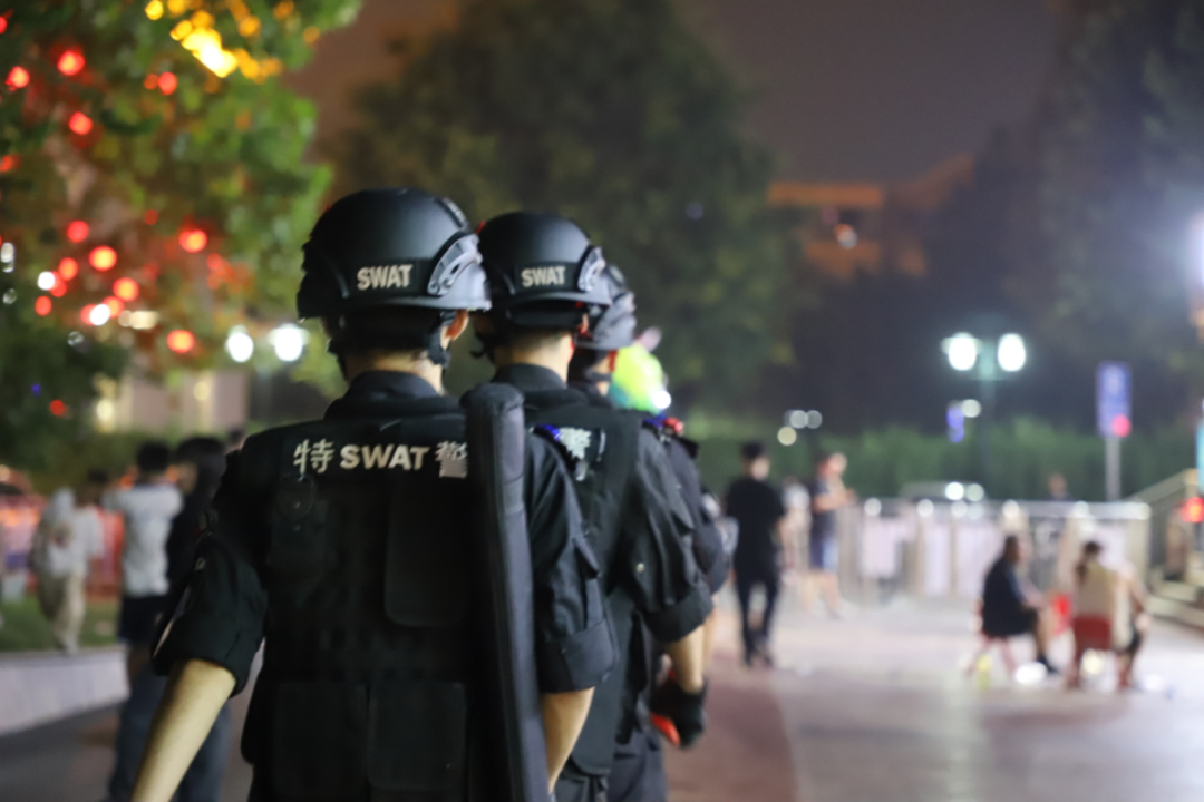 隨著霓虹燈點亮,充滿活力的雄州路在夜色中更加熱鬧,一隊巡邏民警步伐堅定走過路口。不管是在喧鬧的夜市街區(qū),還是在寧靜的背街小巷,隨處可見民警巡邏、警燈閃爍。