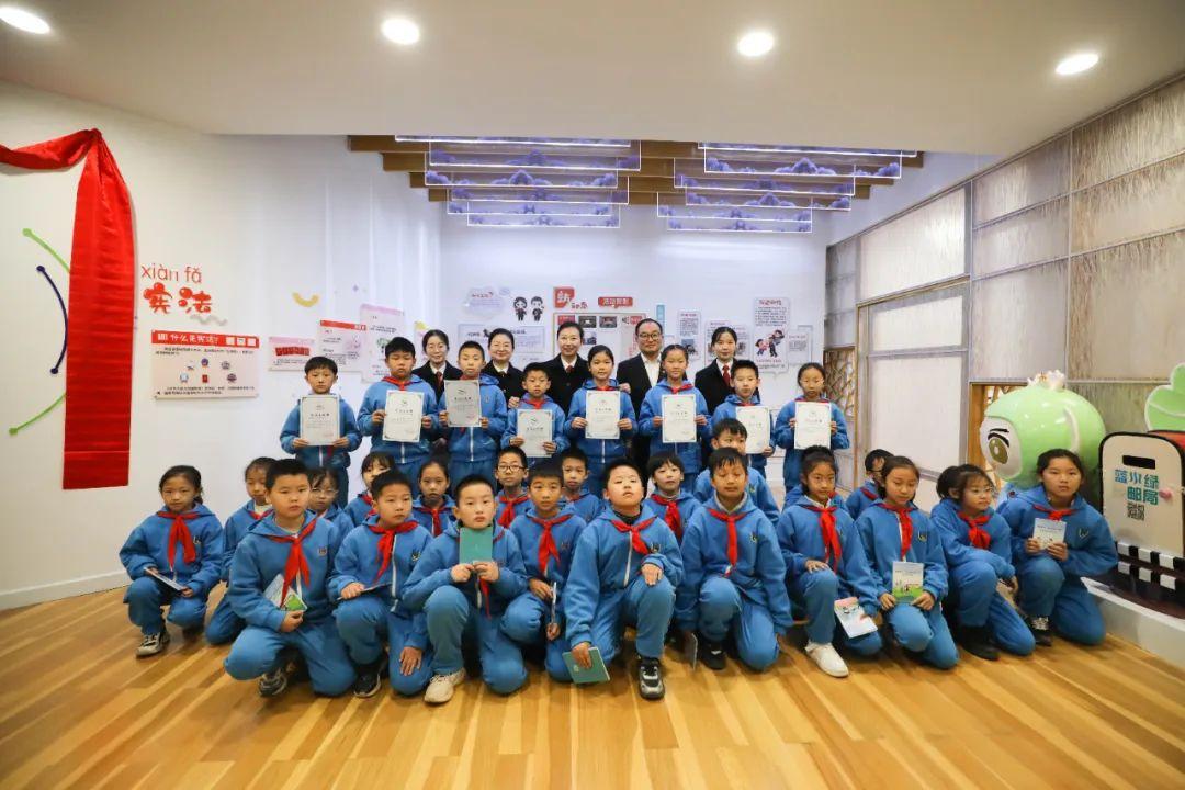副院長李靜靜與校長張欣欣共同為法治角揭牌,標(biāo)志著啟動區(qū)首個院校共建的法治角正式啟動運(yùn)行。中院法官助理安夢瑩帶領(lǐng)在場的領(lǐng)導(dǎo)和師生代表們開啟法治角首次“參觀打卡”,通過基地設(shè)置的趣味橫生的圖畫和生動形象的文字共同學(xué)習(xí)了憲法、未成年人保護(hù)法等重要法律法規(guī)內(nèi)容,認(rèn)識了白洋淀生態(tài)環(huán)境保護(hù)小衛(wèi)士“藍(lán)小綠”,了解了白洋淀豐富多樣的鳥類資源。最后,大家齊聲朗讀中院干警自編自創(chuàng)的“三字經(jīng)”,一字一句,鏗鏘有力,現(xiàn)場洪亮整齊的聲音激蕩回響。在知識問答環(huán)節(jié),同學(xué)們積極舉手,踴躍發(fā)言,干警為8名表現(xiàn)突出的同學(xué)頒發(fā)了“法治小先鋒”證書,未來這一年,他們將肩負(fù)法治宣傳員的使命,努力尊法學(xué)法守法用法,將所學(xué)所知傳播給同學(xué)、家人。