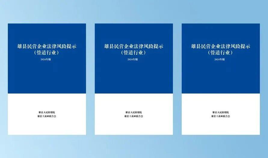 1月10日,雄縣管道行業(yè)協(xié)會2025年年會召開。會上,雄縣人民檢察院會同雄縣工商業(yè)聯(lián)合會正式發(fā)布《雄縣民營企業(yè)法律風(fēng)險提示(管道行業(yè))2024版》(以下簡稱《提示》)。
