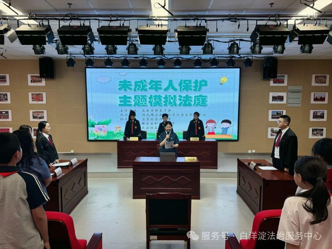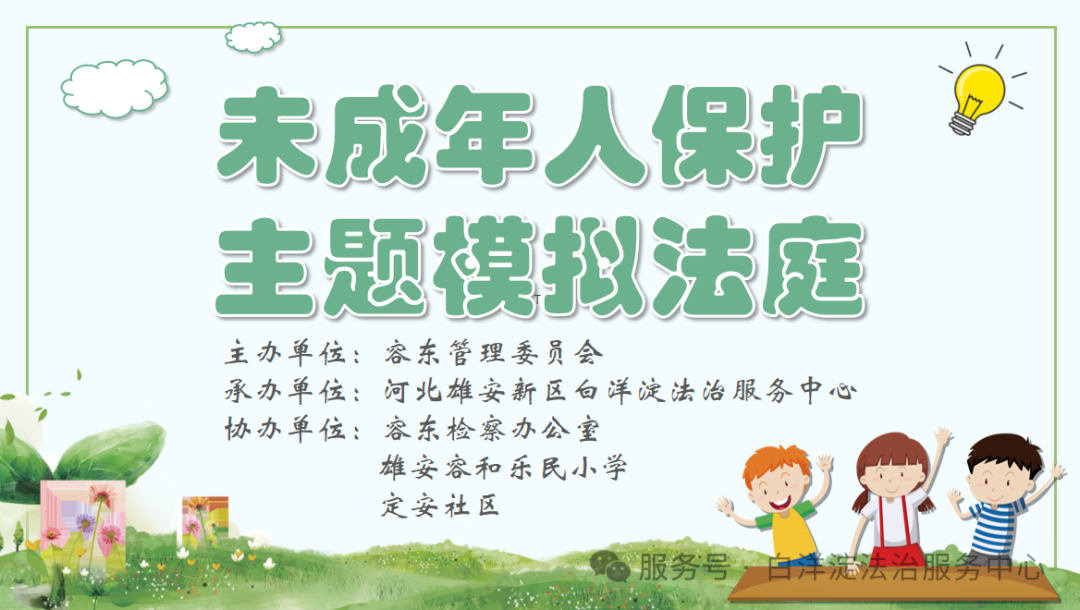 受容東片區(qū)管理委員會(huì)委托,河北雄安新區(qū)白洋淀法治服務(wù)中心在容東檢察辦公室、雄安容和樂(lè)民小學(xué)、定安社區(qū)的配合下,組織在校學(xué)生開(kāi)展了以未成年人保護(hù)為主題的模擬法庭活動(dòng),為同學(xué)們帶來(lái)了一堂別開(kāi)生面的法治教育課。
