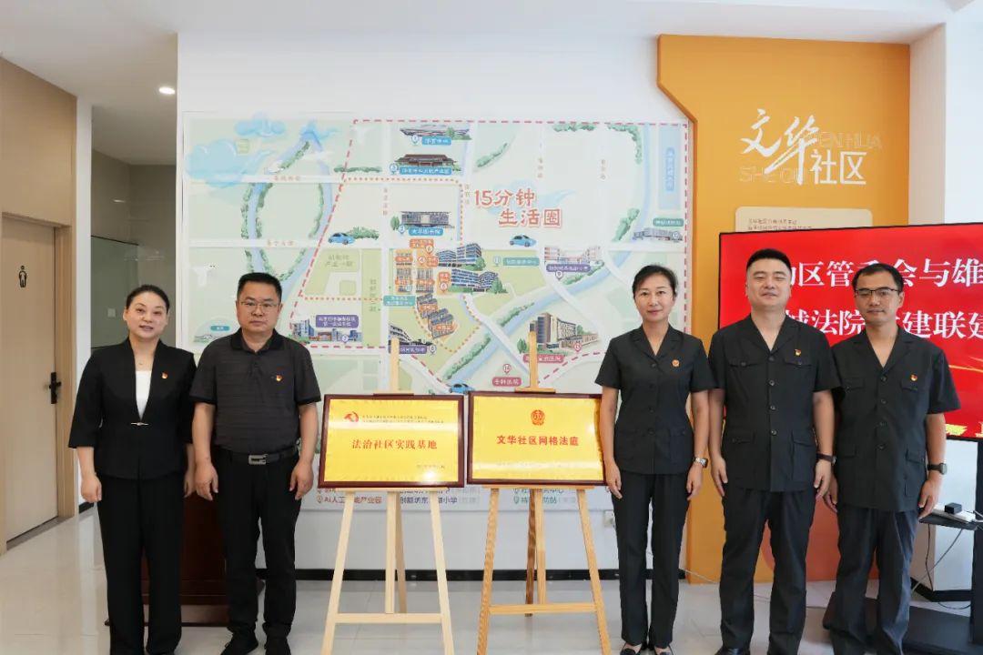 為促推基層治理法治化水平“上臺(tái)階”,8月19日,河北雄安新區(qū)中級(jí)人民法院、容城縣人民法院與雄安新區(qū)啟動(dòng)區(qū)管理委員會(huì)在文華社區(qū)開展黨建聯(lián)建活動(dòng)。雄安新區(qū)社會(huì)工作部副部長張春雷,雄安中院黨組副書記、副院長李靜靜共同為“法治社區(qū)實(shí)踐基地”和“文華社區(qū)網(wǎng)格法庭”揭牌。啟動(dòng)區(qū)管委會(huì)黨組成員、副主任黃媛媛,容城法院黨組成員、副院長郭凱以及黨員干警、社區(qū)群眾代表30余人參加活動(dòng)。