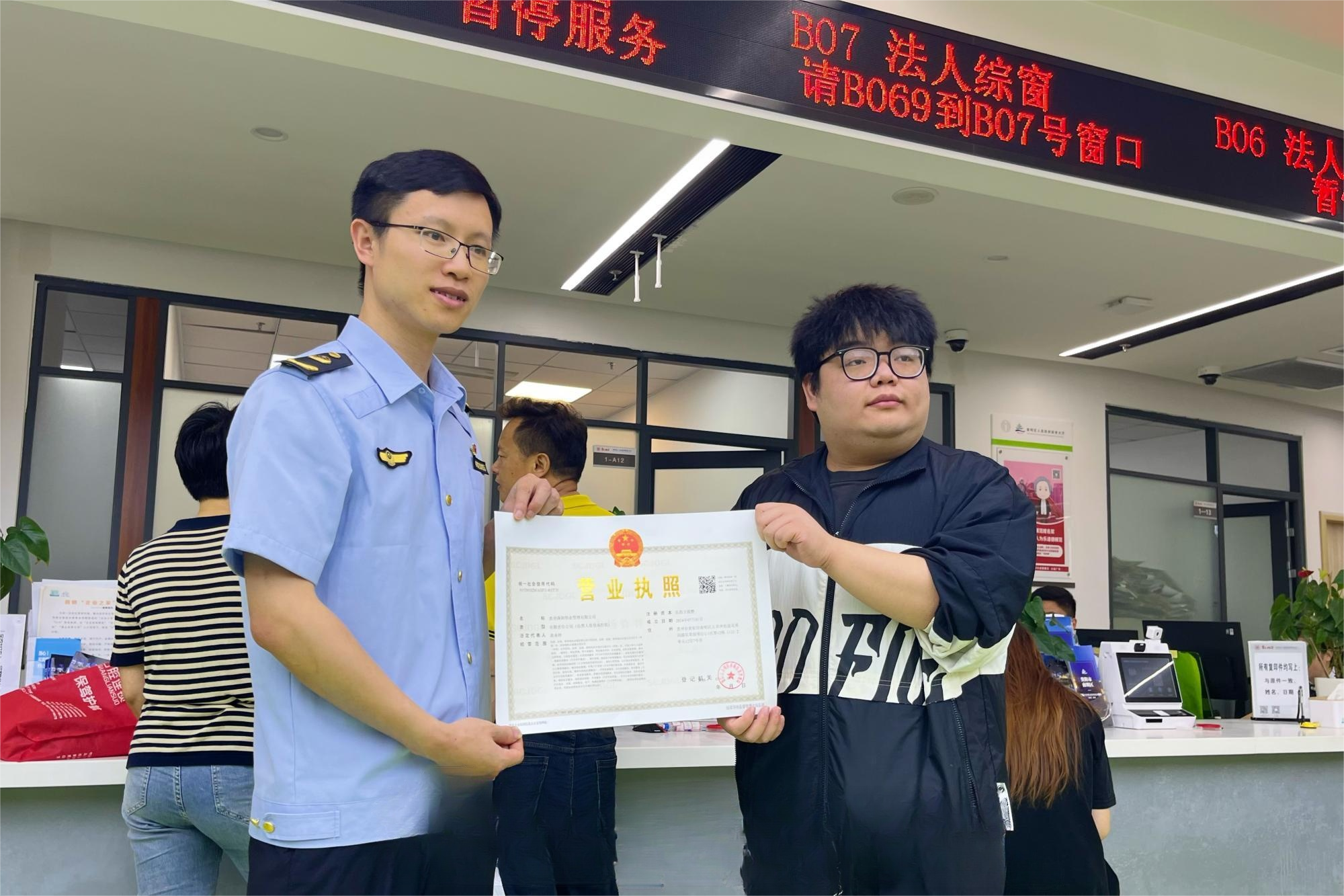 7月1日上午,在貴陽(yáng)市南明區(qū)政務(wù)服務(wù)中心市場(chǎng)監(jiān)管窗口,貴州森炳物業(yè)管理有限公司負(fù)責(zé)人黃垚不到一個(gè)小時(shí)便順利完成注冊(cè)登記,領(lǐng)取了營(yíng)業(yè)執(zhí)照。