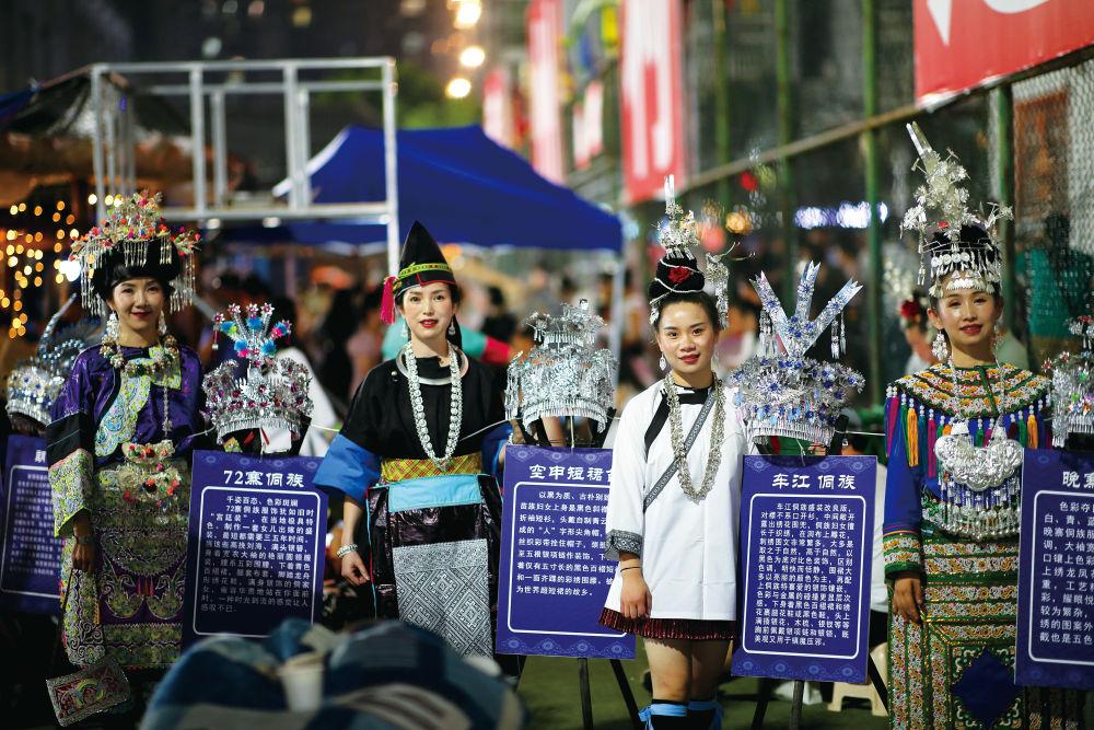 “村超”現(xiàn)場,當?shù)厣贁?shù)民族身著盛裝,向外來游客展示本民族服飾文化
