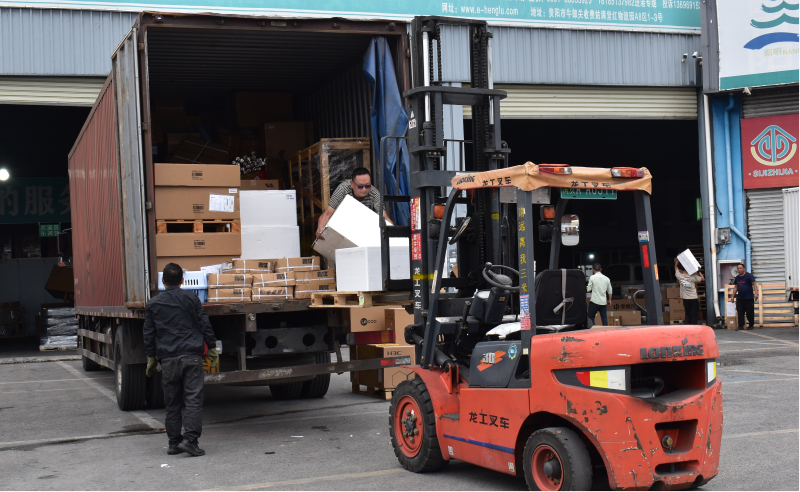 入口處,一輛輛貨車拖著長(zhǎng)長(zhǎng)的尾箱魚貫駛?cè)?;園區(qū)內(nèi),100余輛叉車往來(lái)穿梭,不停地卸貨、裝貨。