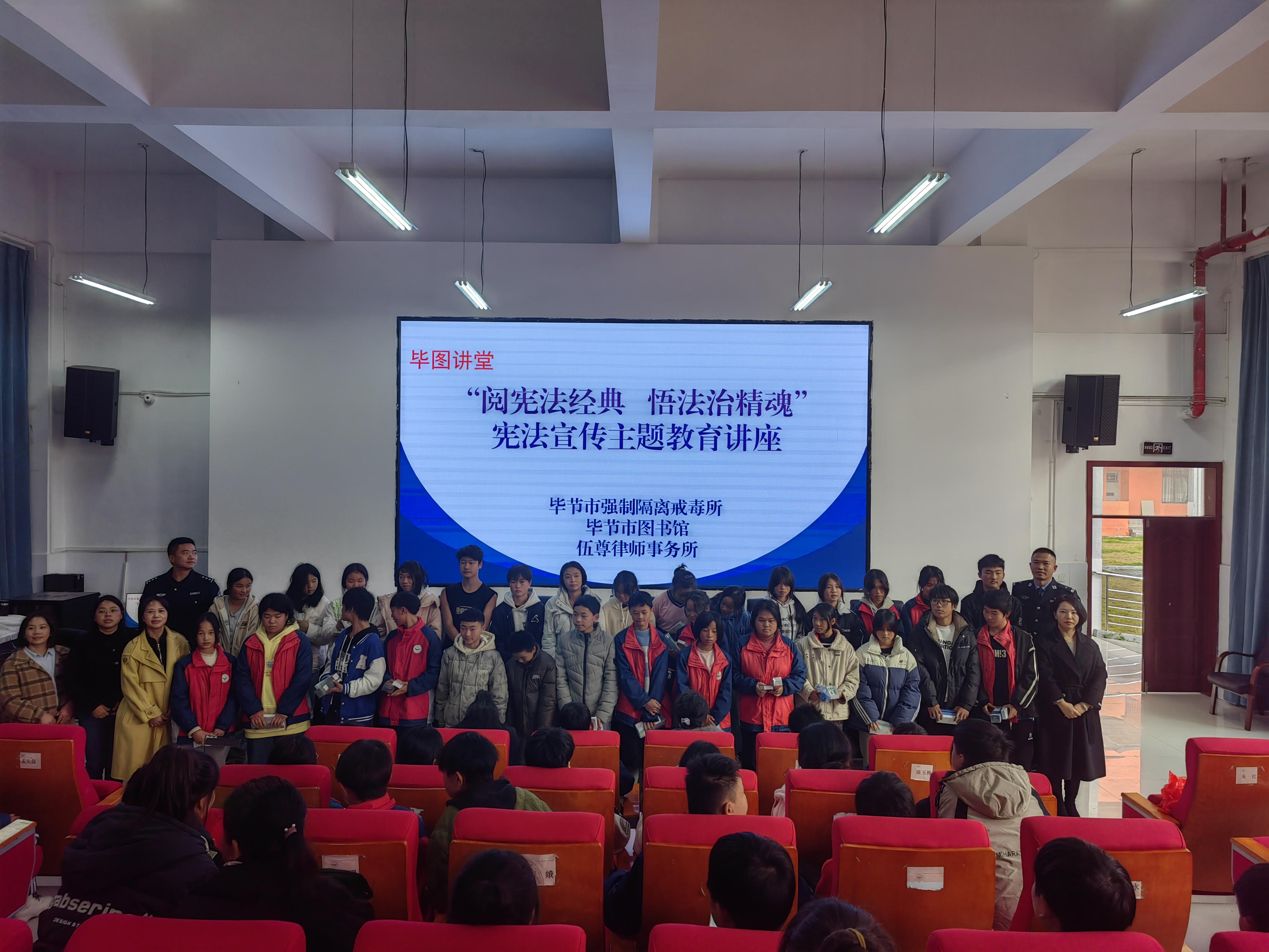 近日,貴州省畢節(jié)強(qiáng)制隔離戒毒所聯(lián)合畢節(jié)市圖書館、畢節(jié)市律師協(xié)會(huì)公益法律服務(wù)和社會(huì)責(zé)任委員會(huì)、伍尊律師事務(wù)所,共同走進(jìn)七星關(guān)區(qū)荔灣實(shí)驗(yàn)學(xué)校開展“閱憲法經(jīng)典 悟法治精魂”憲法宣傳周活動(dòng)。