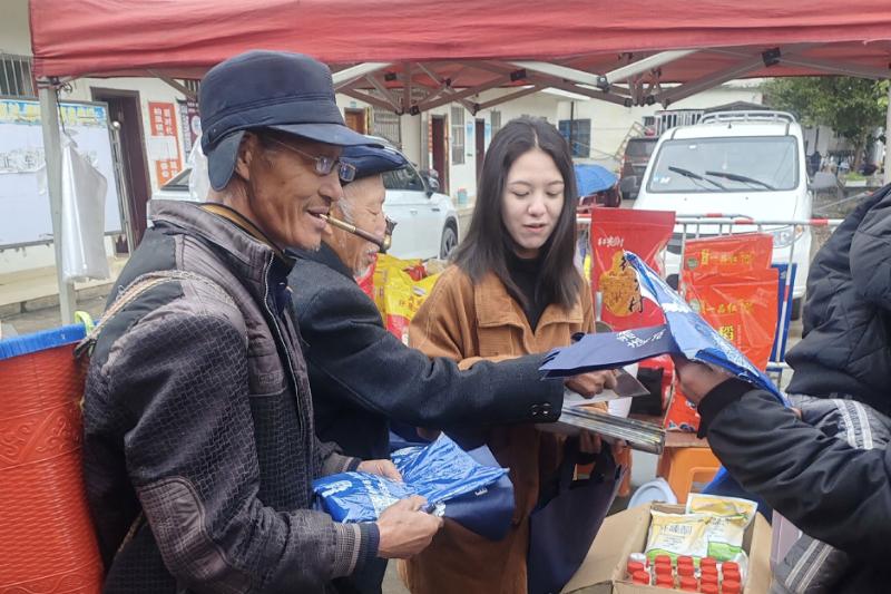 圖為趕集日工作人員向過(guò)往群眾發(fā)放宣傳手冊(cè)。