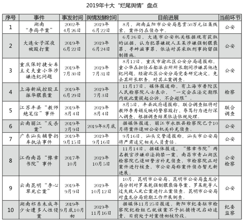 編者按:今年的網(wǎng)絡(luò)輿論場并不平靜,多起涉政法事件引爆輿論場,并發(fā)酵成為全網(wǎng)關(guān)注的熱點(diǎn)輿情,引發(fā)輿論震動。如備受輿論矚目的孫小果案、鄧世平案,從曝光之日起,就牽動著無數(shù)輿論目光。近日,相關(guān)涉案人員陸續(xù)受審獲刑,背后的“保護(hù)傘”也被立案調(diào)查。這類重大輿情事件不“爛尾”,體現(xiàn)出各級政法機(jī)關(guān)依法履行職責(zé)的自覺和擔(dān)當(dāng),值得稱道。然而也需看到,2019年接近尾聲,仍有不少輿情事件沒有掃尾,輿論場還遺留大量問號等待拉直。近年來,政法網(wǎng)絡(luò)輿情回應(yīng)率穩(wěn)步提升的前提下,輿情事件的處置完結(jié)率卻忽高忽低,2019年上半年不到六成事件有最終結(jié)果,遠(yuǎn)低于2018年全年75%的比率。鑒于此,法制網(wǎng)輿情中心(ID:fzwyqzx)盤點(diǎn)這一年的重大政法輿情事件,梳理出那些長時間沒有進(jìn)展和結(jié)果的“爛尾輿情”,并通過分析其類型、總結(jié)其特征、剖析其危害,提出規(guī)避與應(yīng)對的建議,以供有關(guān)部門參考借鑒。