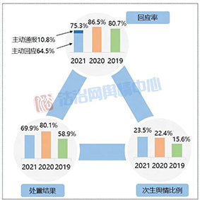 從回應(yīng)主體來看,與2020年相比,由涉事部門進行回應(yīng)的事件數(shù)量占比有所增加,達到62.9%,表明涉事主體主動作為的積極性有所提升;而上級主管部門介入回應(yīng)的比重下降了近7個百分點,側(cè)面反映出涉事部門輿情應(yīng)對能力在逐步精進,能夠較為及時遏制輿情擴散和波及的范圍,一定程度上減輕了級主管部門的應(yīng)對壓力。同時,第三方回應(yīng)的事件數(shù)量比重也略微提升了約2個百分點,顯示出不少輿情事件呈現(xiàn)復雜化特征,牽涉主體逐漸多元化并且覆蓋多個領(lǐng)域系統(tǒng),這對部門間的協(xié)調(diào)銜接工作也提出了更高的要求。此外政法機關(guān)內(nèi)部多主體回應(yīng)的情況稍有減弱,相關(guān)案例所占比重較2020年減少了一半以上,為4.9%。