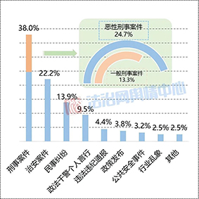 涉法輿情事件158起,占比95.2%。由刑事案件引發(fā)的輿情占比最高,達38.0%,其中惡性刑事案件占比24.7%,一般刑事案件占比13.3%。治安案件、民事糾紛、違紀違法通報引發(fā)的輿情分別占比22.2%、13.9%、4.4%。民事糾紛中,涉及婚姻問題尤其離婚的案事件同比較多,如福建連城縣法院發(fā)出首張“離婚冷靜期通知書”、湖南女子5年4次起訴離婚均被駁回、全國首例家庭勞務(wù)補償案宣判等。政策發(fā)布、公共安全事件引發(fā)的輿情分別占比3.8%、3.2%。此外,教育等行業(yè)亂象波及政法機關(guān)的輿情占比2.5%,其他輿情事件占比2.5%。