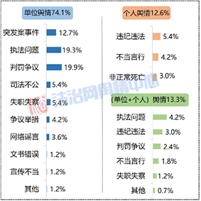 從輿情類型來看,責任主體分為三個層面:涉及政法單位的輿情占比74.1%,涉及政法干警個人的輿情占比12.7%,涉及單位和個人的復合輿情占比13.3%。