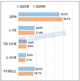 從輿情爆發(fā)時長來看,2021年與2020年的整體差別不大,從事發(fā)到輿情發(fā)酵的所用時間依舊偏短,主要爆發(fā)時長都集中在7天以內(nèi),占比累計超六成,其中1天內(nèi)爆發(fā)的輿情事件比重遠高于其他時長的,達到45.5%。由此可見,在以移動社交媒體為主要傳播途徑的時代,信息傳播速度不斷提升,輿論節(jié)奏也被持續(xù)壓縮。例如在網(wǎng)民“辣筆小球”侮辱戍邊英烈一案中,其違法言論一經(jīng)發(fā)布便遭到網(wǎng)民譴責,事發(fā)后不到12小時,個人微博被禁言,當天新華社、《人民日報》等央媒對此事發(fā)表評論,次日當?shù)鼐骄蛯ο右扇瞬扇⌒淌聫娭拼胧┎⑦M行通報,事件從發(fā)酵到處置僅用一天左右的時間,進展速度很快。此外,與2020年相比,2021年中輿情發(fā)酵與事發(fā)間隔1至3年的事件占比翻番,達到7.2%,如北京“教授狀告知網(wǎng)侵權(quán)案”在獲得新進展之后再度引發(fā)關(guān)注,說明無論案件是否已經(jīng)閉環(huán),只要爭議尚存,輿情就仍有復燃的風險。