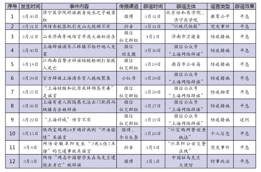 就個案辟謠效果而言,上海網(wǎng)信部門通過專業(yè)人士現(xiàn)身說法,從核酸檢測器材制作流程、生產規(guī)范切入,詳實有據(jù)地澄清謠言,受到輿論的廣泛認可。上海作為疫情嚴峻復雜地區(qū),也是網(wǎng)絡謠言的重災區(qū),對此,上海市加大辟謠工作力度,組織了由各級警方新媒體賬號,微信公眾號“上海辟謠平臺”“上海網(wǎng)絡辟謠”及東方網(wǎng)等媒體平臺構成的辟謠隊伍,辟謠途徑較為豐富,信息發(fā)布頻率有了顯著增加。但部分謠言辟謠時間超過48小時,個別案例辟謠效果不理想,有些謠言類型重復出現(xiàn),這些情況表明當?shù)叵嚓P部門對謠言的應對機制還有待進一步完善。