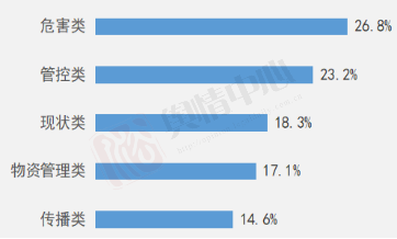 根據(jù)網(wǎng)絡(luò)謠言涉及內(nèi)容及影響的不同,上海涉疫謠言主要分為疫情的危害、管控、現(xiàn)狀、物資管理以及傳播五種類型。其中,危害類謠言比重最高,達(dá)到26.8%,主要指疫情本身或者防疫工作帶來的不利影響,如“靜安區(qū)58歲獨(dú)居男子餓死家中”“梅隴七村孕婦早產(chǎn)求助未果致死”“虹口區(qū)衛(wèi)健委干部錢文雄及其妻子自盡”等謠言。管控類謠言占比23.2%,主要涉及防疫及管控相關(guān)措施,如“上海馬上封城7天”“武警將接管上海社區(qū)”等謠言,對公眾日常生活和出行造成影響,關(guān)注度較高。位居第三位的是現(xiàn)狀類謠言,多與確診人數(shù)有關(guān),如“黃浦一養(yǎng)老院出現(xiàn)大量無癥狀感染者”“楊浦區(qū)幼小初學(xué)生檢測出確診病例”等,多指向人員密集區(qū)域或流動性大的行業(yè),制造出疫情形勢嚴(yán)峻的假象。物資管理類謠言涉及抗疫物資接收、發(fā)放、登記等管理工作,如“原浦東新區(qū)北蔡鎮(zhèn)領(lǐng)導(dǎo)倒賣保供物資”“靜安區(qū)石門二路街道給市政協(xié)家屬院發(fā)放進(jìn)口物資”等,呈現(xiàn)出故意挑起地域沖突、干群沖突的跡象。傳播類謠言占比14.6%,主要涉及編造故意傳播病毒、物傳人等情節(jié),如“有‘臥底’在樓宇里‘播毒’”謠言。