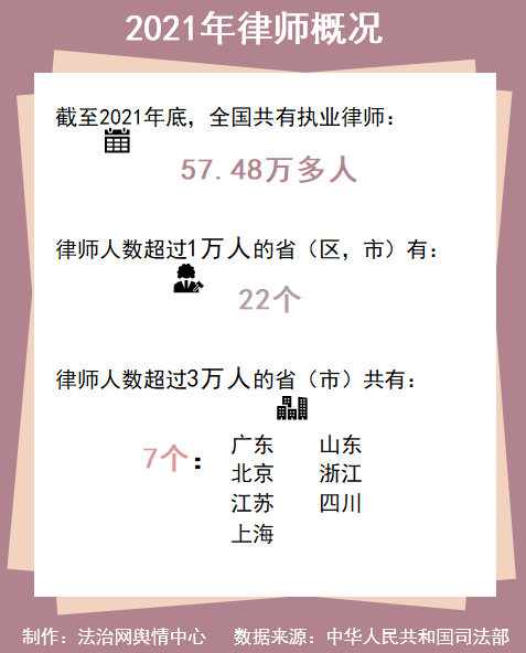 2017年至2021年,我國(guó)執(zhí)業(yè)律師人數(shù)每年都在以超過10%的速度增長(zhǎng)。截至2021年底,全國(guó)共有執(zhí)業(yè)律師57.48萬多人,律師人數(shù)超過1萬的?。▍^(qū)、市)有22個(gè),律師人數(shù)超過3萬的省(市)有7個(gè)。