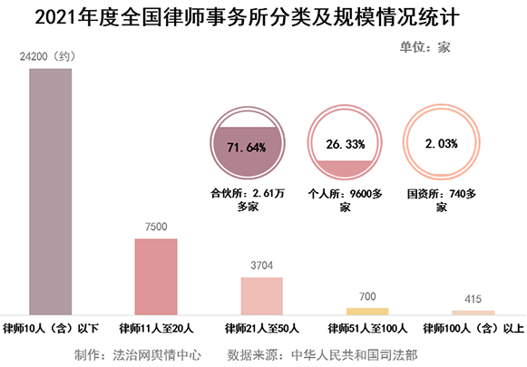 從律所規(guī)模上看,“10人及以下”律所最多,達(dá)2.42萬家,“11人至20人”律所次之,達(dá)7500家。“100人及以上”的大型律所共有415家。