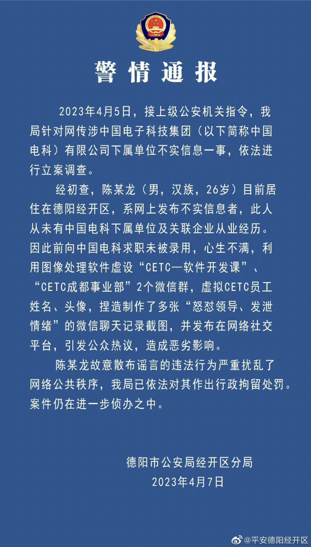 4月7日,大皖新聞報道稱,網(wǎng)傳加班事件當事人陳志龍為四川省德陽市經(jīng)開區(qū)某科技公司員工,德陽市人社局辦公室也回應稱“正在進行調(diào)查”。4月7日晚間,四川省德陽市公安局經(jīng)開區(qū)分局通過官方微博發(fā)布警方通報稱,陳某龍從未有中國電科下屬單位及關(guān)聯(lián)企業(yè)從業(yè)經(jīng)歷,其因此前向中國電科求職未被錄用,心生不滿,利用圖像處理軟件虛設“CETC—軟件開發(fā)課”“CETC成都事業(yè)部”2個微信群,虛擬CETC員工姓名、頭像,捏造制作了多張“怒懟領(lǐng)導、發(fā)泄情緒”的微信聊天記錄截圖,并發(fā)布在網(wǎng)絡社交平臺,造成惡劣影響。目前陳某龍已被警方行政拘留。4月8日,微博平臺官方表示,已清理此事件中散布不實信息、惡意攻擊國企體制的違規(guī)內(nèi)容5792條,并對“@老c隊長”等9個違規(guī)“自媒體”賬號及253個違規(guī)用戶予以禁言處置。