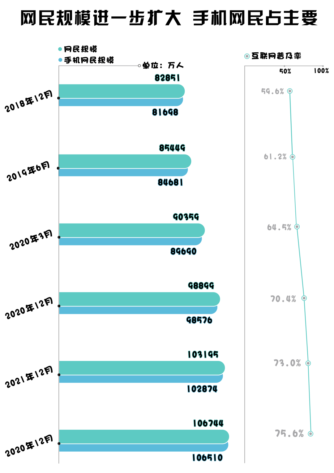 根據(jù)中國互聯(lián)網(wǎng)絡(luò)信息中心(CNNIC)發(fā)布的第51次《中國互聯(lián)網(wǎng)絡(luò)發(fā)展狀況統(tǒng)計報告》(以下簡稱:《報告》)顯示,截至2022年12月,我國網(wǎng)民規(guī)模達到10.67億,互聯(lián)網(wǎng)普及率達 75.6%?;ヂ?lián)網(wǎng)絡(luò)發(fā)展呈現(xiàn)哪些特征呢?以下數(shù)據(jù)為您解讀。