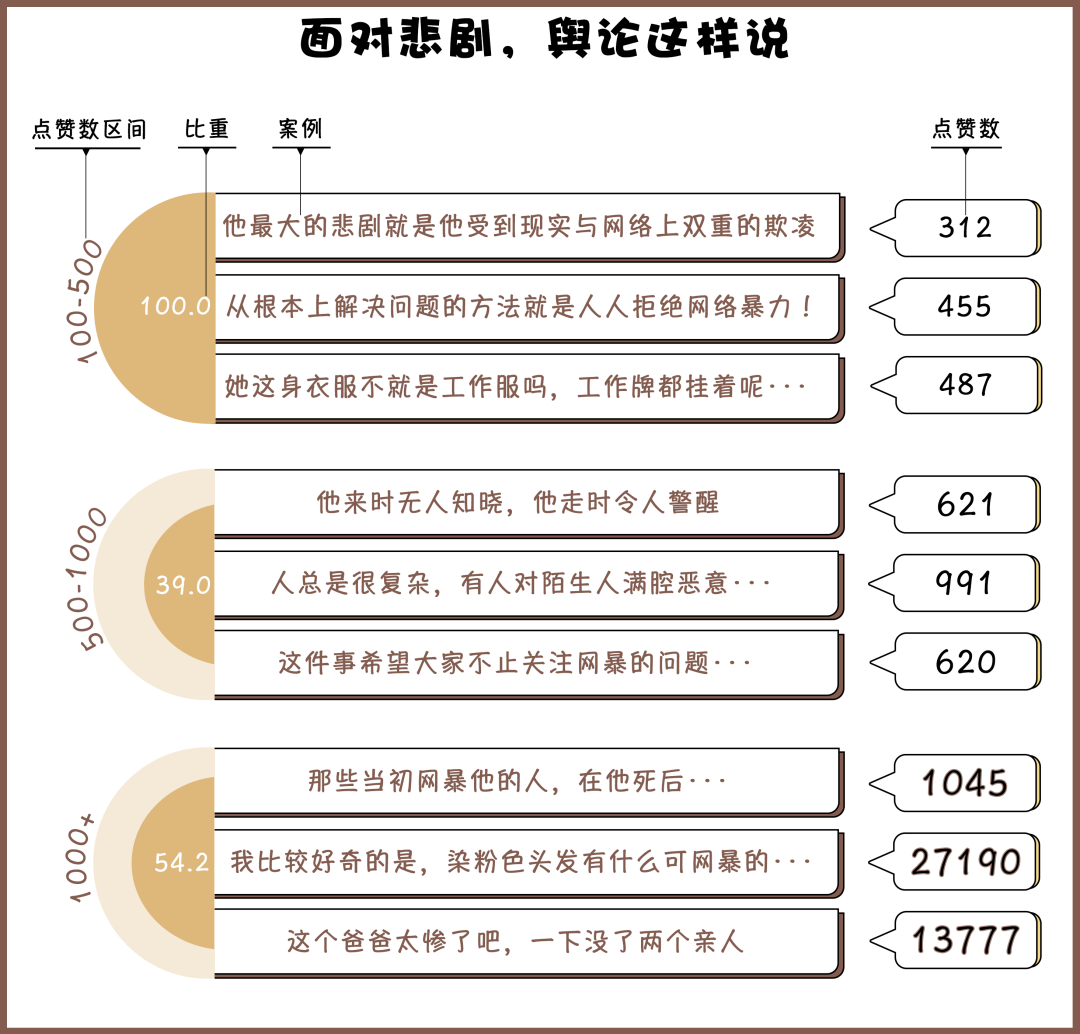 正是因?yàn)椴豢熬W(wǎng)絡(luò)暴力所帶來的重負(fù),多名熱點(diǎn)事件當(dāng)事人選擇以結(jié)束生命的方式表達(dá)抗?fàn)?。“雪崩的時(shí)候沒有一片雪花是無辜的”,對于網(wǎng)絡(luò)暴力而言,一句看似“輕飄飄”的評論,也許就成為了“壓死駱駝的最后一根稻草”。
