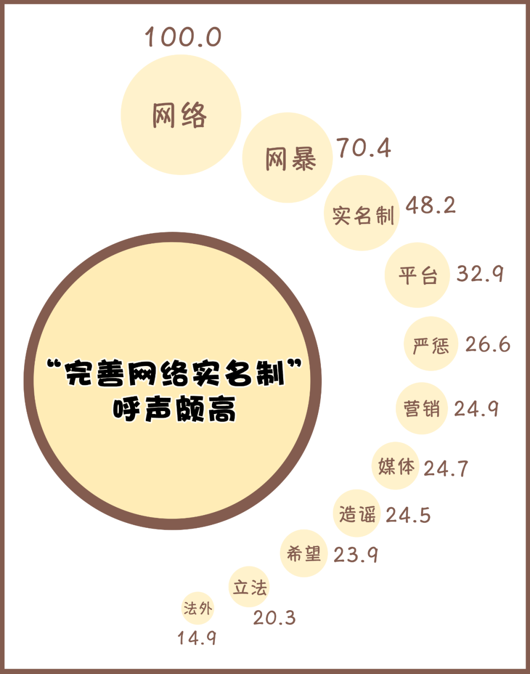 網(wǎng)絡(luò)暴力實(shí)施者借助網(wǎng)絡(luò)的隱蔽性,披著“隱形的斗篷”躲在暗處,享受著施暴的快感。對此,網(wǎng)民也紛紛發(fā)表觀點(diǎn)。分析“網(wǎng)絡(luò)暴力”有關(guān)熱門帖文下的評論可以看出,“實(shí)名制”“平臺”“嚴(yán)懲”等詞語出現(xiàn)頻率較高。